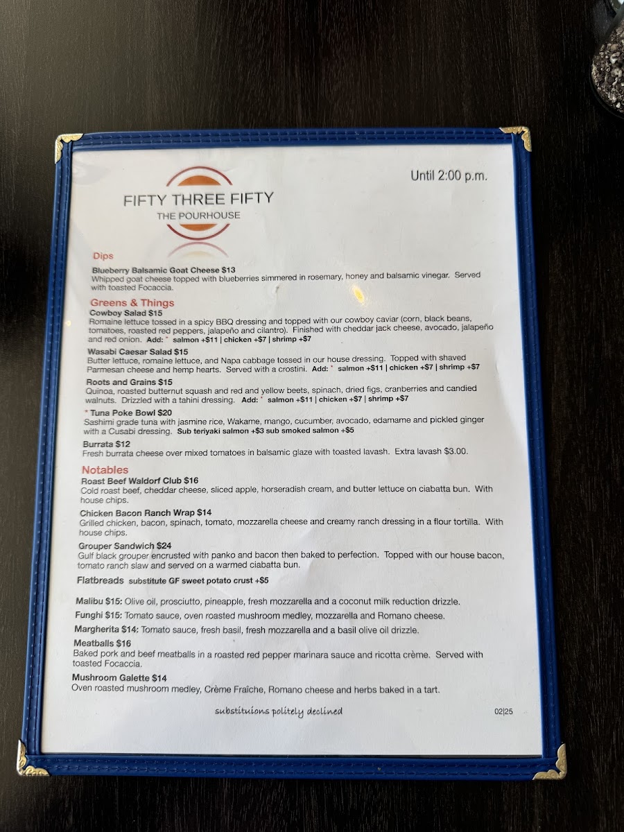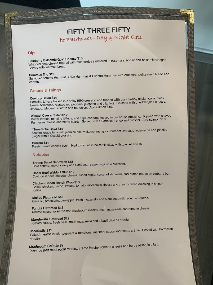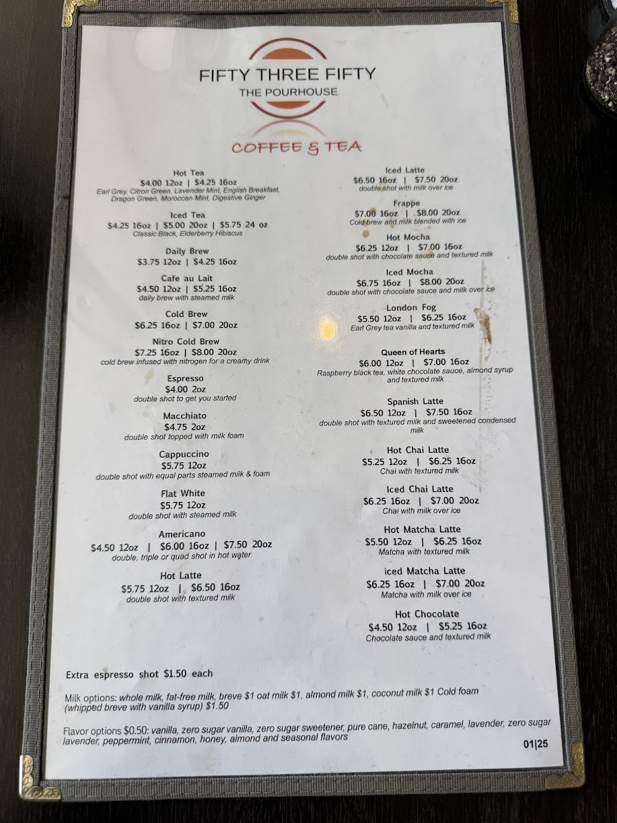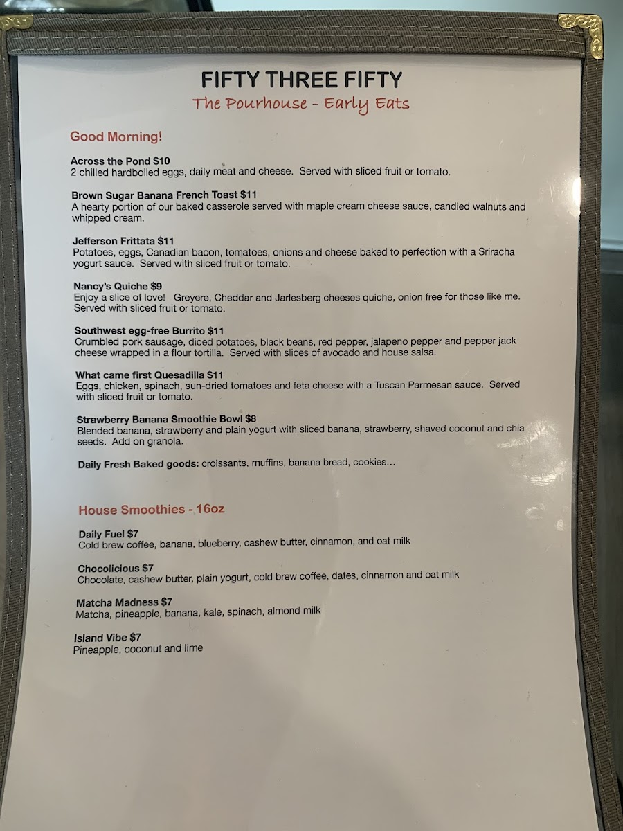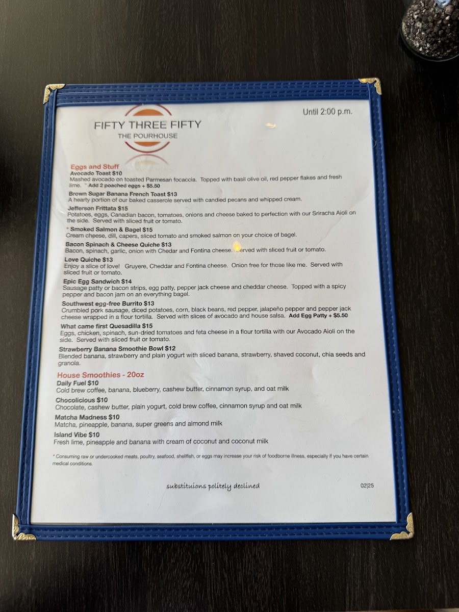 From a reviewer's perspective, the menu at Fifty Three Fifty, The Pourhouse impresses with its balance of inventive brunch offerings and comforting favorites. Breakfast enthusiasts will appreciate dishes like the Avocado Toast and the indulgent Brown Sugar Banana French Toast, alongside the Jefferson Frittata and Bacon Spinach & Cheese Quiche, which showcase thoughtful flavor combinations. Smoothie lovers can choose from hearty options such as the Daily Fuel, Chocolicious, Matcha Madness, and Island Vibe in generous 20oz servings. For lighter bites or sharing, the Blueberry Balsamic Goat Cheese and Hummus Trio offer fresh, vibrant flavors. Salads like the Cowboy Salad, Wasabi Caesar Salad, and Roots and Grains Burrata highlight the restaurant’s commitment to creative, satisfying greens. Sandwich aficionados are drawn to the Roast Beef Waldorf Club, a standout among the heartier options. Coffee and tea selections round out the menu, with offerings like Iced Latte, Frappe, Hot Mocha, Nitro Brew, Pour Over, Mocha Latte, and Chai Tea Latte, ensuring a beverage for every palate. Overall, the menu at Fifty Three Fifty delivers a diverse range of choices that combine classic comfort with inventive twists, appealing to both casual diners and those seeking a flavorful, elevated breakfast or lunch experience.